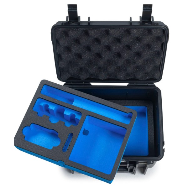 INTÉRIEUR : Valise avec un insert en mousse noire et bleue pour la DJI Osmo Action 6 et ses accessoires. La mousse du couvercle assure un maintien optimal : robuste, parfaitement ajustée et idéale pour le transport.