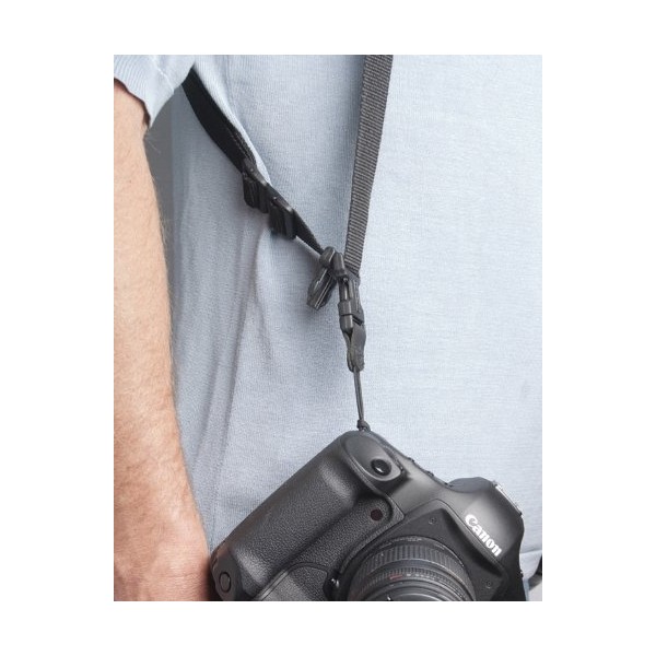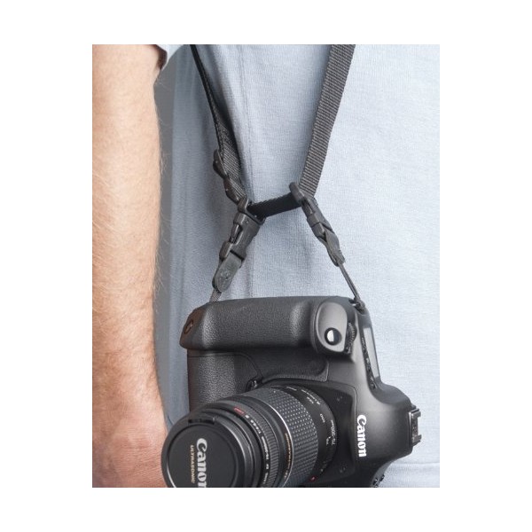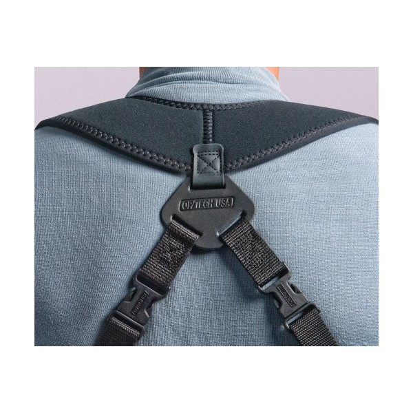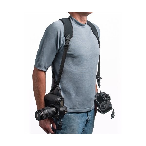 Le bloc néoprène du harnais en forme de U distribue efficacement et équilibre le poids de deux appareils photo en absorbant le choc des mouvements du photographe.