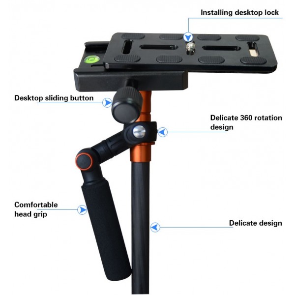 Stabilisateur en fibre de carbone conçu pour les appareils photo compacts pesant jusqu'à 2 kg.