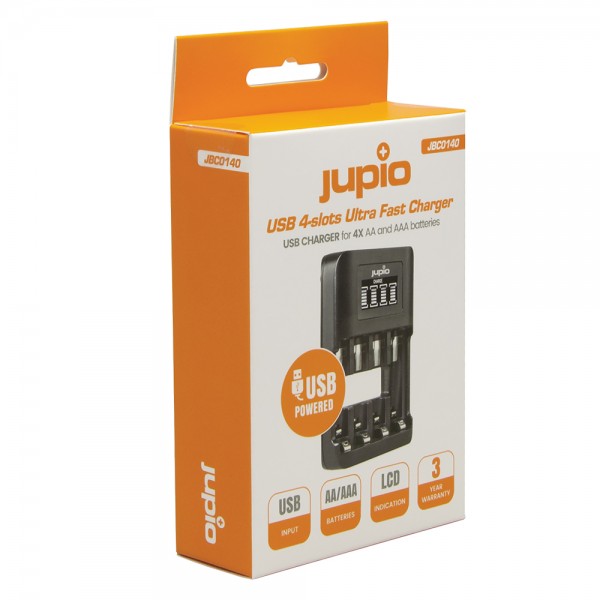 Chargeur de batterie ultra rapide pour piles AA et AAA avec 4 canaux de charge individuels et un écran LCD. Le JBC0140 est alimenté par USB et peut facilement être chargé via un chargeur de téléphone ou de tablette.