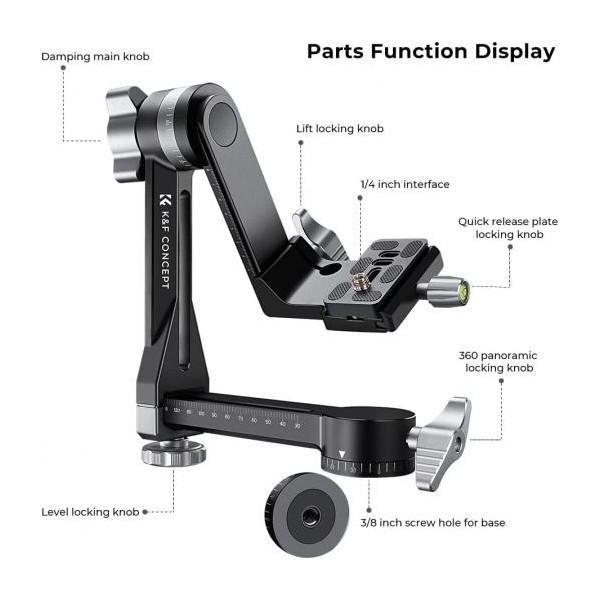 Tête panoramique à 360 degrés : permet une rotation de la base panoramique et du bras vertical à 360°. Le bras peut obtenir un réglage d’horizontal et vertical jusqu'à 100 mm. L'appareil restera maintenu grâce a une forte force de verrouillage.
