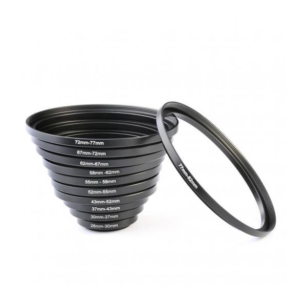Le kit comprend : 11 pièces en métal générique Step Up Ring 26-30 mm, 30-37 mm, 37-43 mm, 43-52 mm, 52-55 mm, 55-58 mm, 58-62 mm, 62-67 mm, 67-72 mm, 72-77 mm, 77-82MM