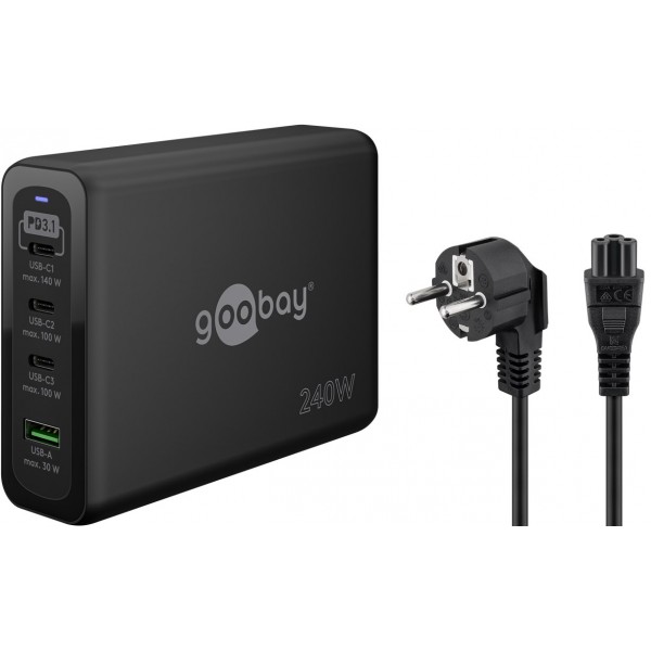 Les semi-conducteurs dotés de la technologie GaN permettent une charge plus rapide et plus efficace et une conception plus légère et plus compacte par rapport aux chargeurs conventionnels. L'électronique de protection intégrée du chargeur USB-C™ protège les appareils connectés contre les surintensités, les surcharges et les surchauffes (y compris câble d'alimentation avec fiche de sécurité de type E/F, 1 m)