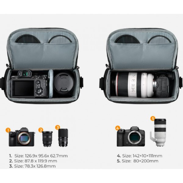 Livré avec 1 séparateur rembourré amovible pour un rangement personnalisé. Après avoir retiré les séparateurs intérieurs, il peut facilement le convertir d'un sac pour appareil photo reflex numérique. Le sac à bandoulière pour appareil photo a une large ouverture avec des fermetures à glissière métalliques YKK à double sens pour un accès facile.