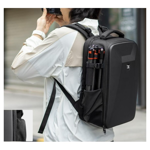 1 poche zippée cachée à l'arrière pour votre téléphone, votre portefeuille et d'autres petits objets. Le support pour trépied est équipé d'une sangle de sécurité sur un côté du sac et 1 poche de l'autre côté.