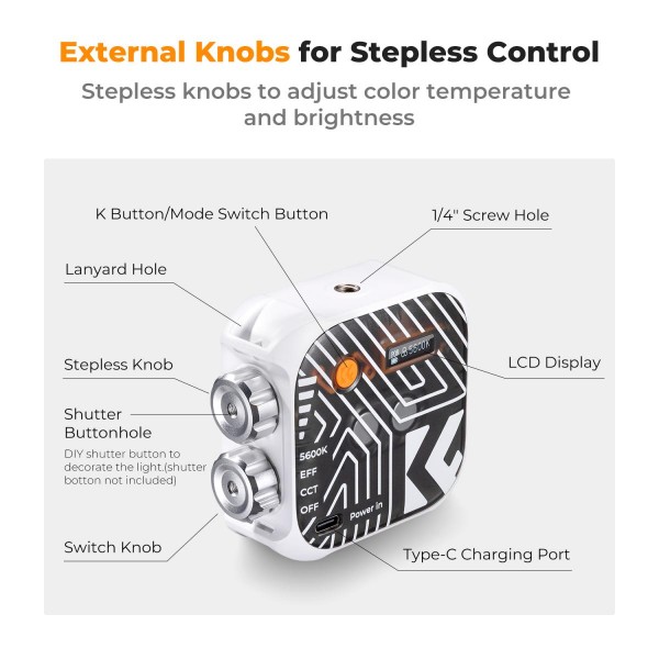 Dispose de deux trous de vis de 1/4", qui peuvent être installés sur un support d'éclairage. Combiné avec l'adaptateur de griffe équipé, il peut être installé sur la caméra. Il y a des aimants à l'arrière du produit. , qui peut être attaché à des objets métalliques.
