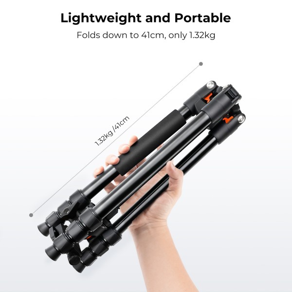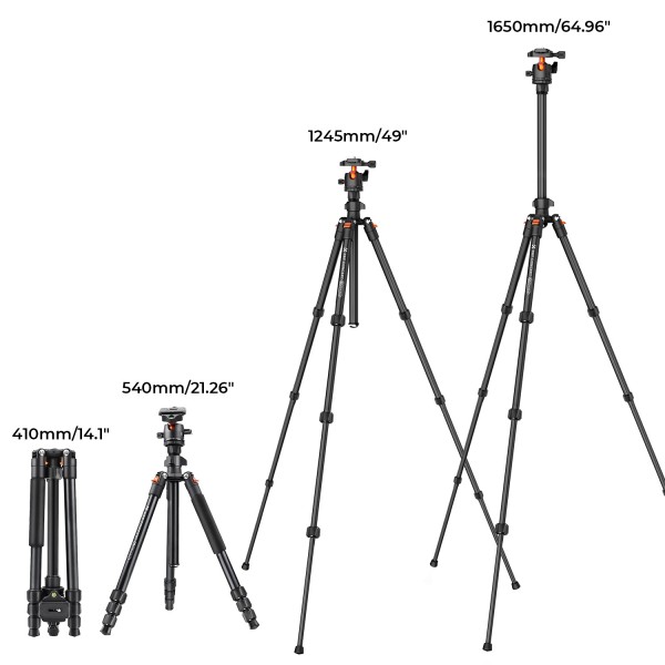 Le pied à 4 sections peut ajuster la hauteur du trépied de 52 cm à 163 cm, il peut être plié à 39 cm pour faciliter son rangement dans le sac de transport.