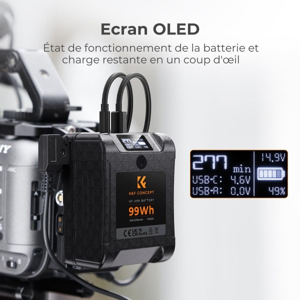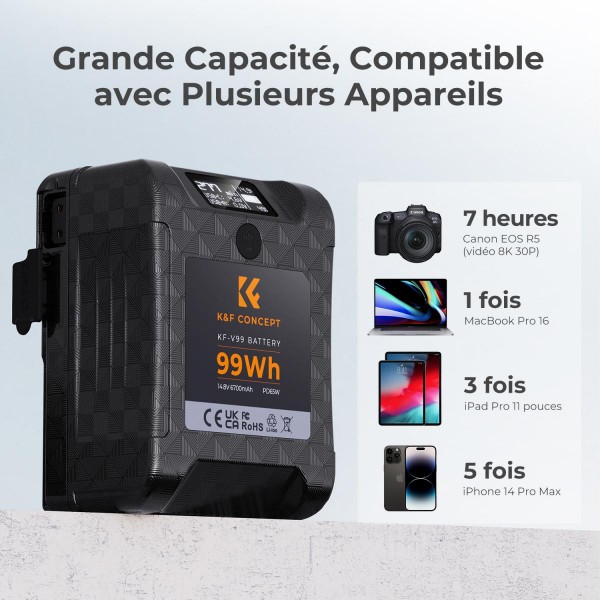Cette batterie V Mount est dotée d'une batterie Li-ion de 99 Wh, 14,8 V, 6 700 mAh, de haute capacité et de haute qualité, qui offre une forte autonomie pour les projets de production vidéo et de photographie de longue durée.