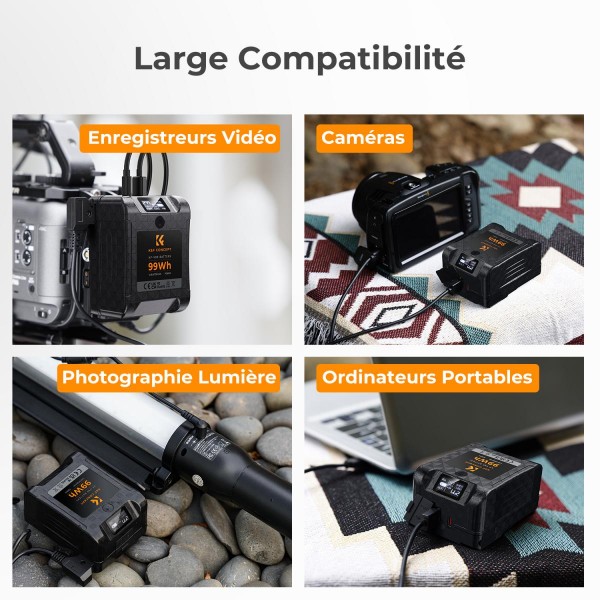 cette cellule de batterie V Mount est livrée avec des ports USB-C, USB-A, BP et D-TAP, qui sont plus polyvalents et prennent en charge l'alimentation de plusieurs appareils en même temps, tels que les appareils photo reflex numériques, les caméscopes, les moniteurs, smartphones, émetteurs vidéo sans fil, tablettes et ordinateurs portables, etc.