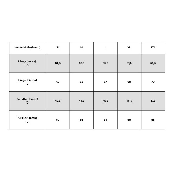 Tableau des tailles :