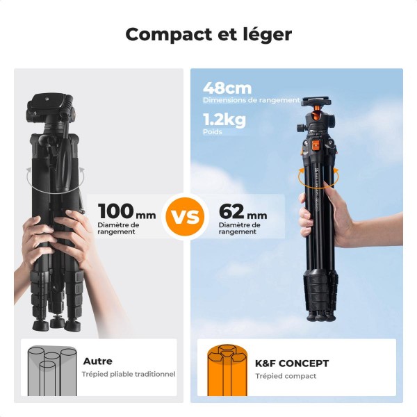 • Pesant seulement 1,2 kg, il est facile à ranger et à transporter sans aucun fardeau, adapté à un usage quotidien, à la prise de vue en extérieur et aux voyages.