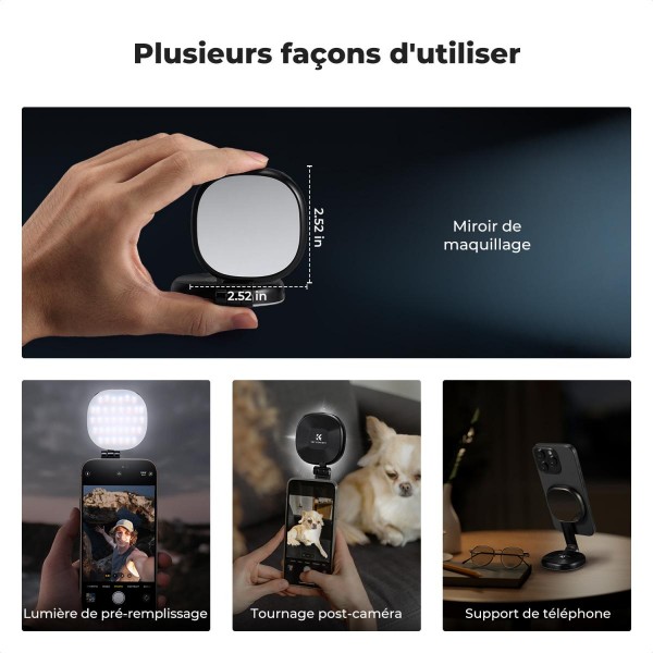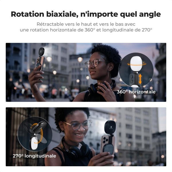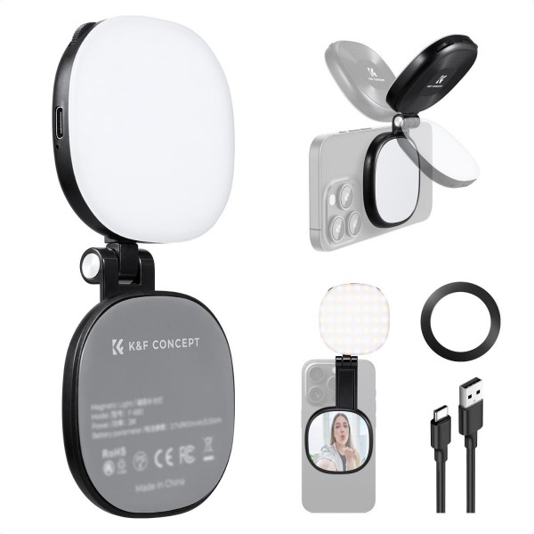 • Grâce à son puissant aimant intégré, cette lampe se fixe directement sur les telephones. Pour les téléphones non magnétiques, utilisez simplement l'anneau métallique adhésif fourni pour une fixation magnétique sur n'importe quel appareil, offrant ainsi une solution d'éclairage sûre et facile pour les créateurs mobiles.