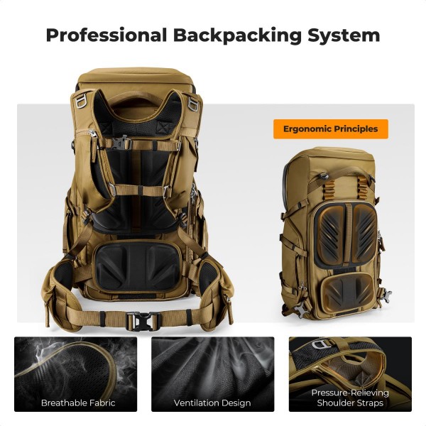 Sac à dos trekking 40 litres pour reflex/appareils hybrides, support trépied et résistant aux intempéries, couleur champagne