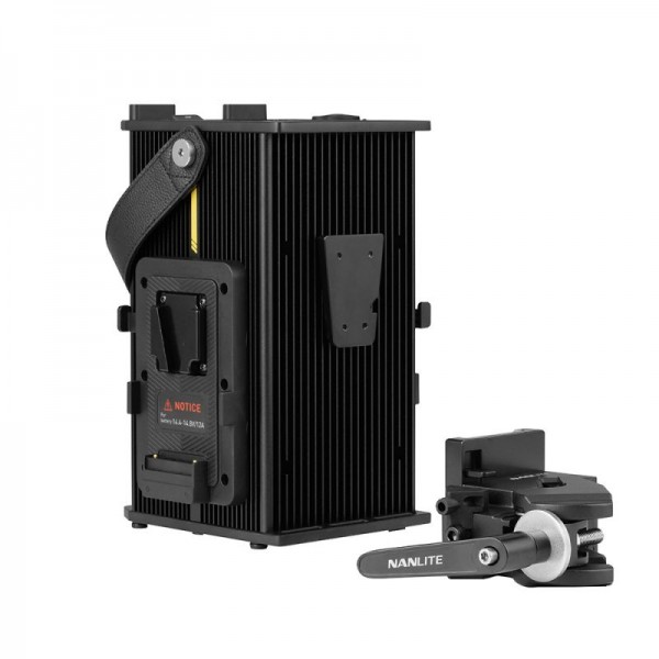 Les plaques de batterie V-Mount sont disposées des deux côtés de l'unité de commande pour une meilleure compatibilité des batteries de différentes tailles.